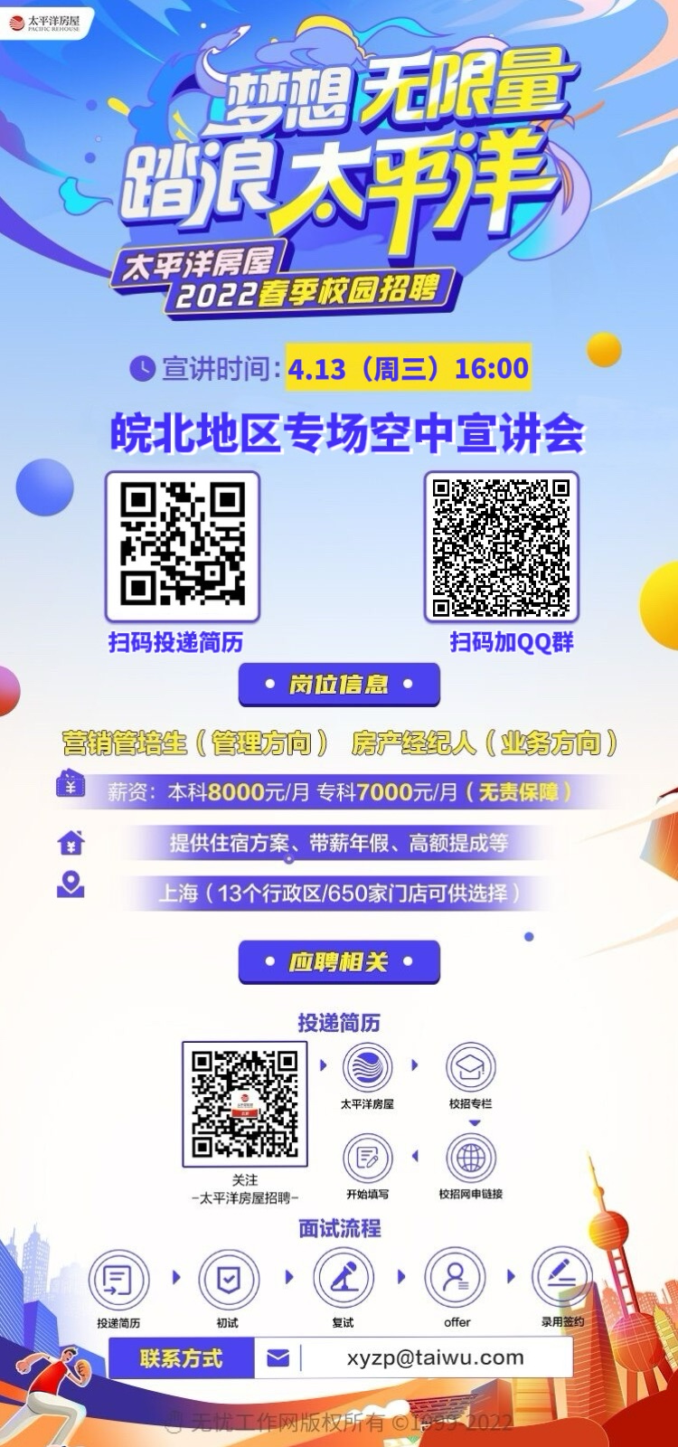 4月13日(周三)16:00 上海太平洋房屋2022春招皖北地区高校专场空中宣讲会 来源: 发布时间:2022-04-11 15:10:49 浏览次数: 次 【字体:小 大】 9个月无责任底薪(本科8000元/月,专科7000元/月),师傅一对一细心带教,平均入职6个月月薪可达15000元更有带薪培训、带薪年假、定期团建、住房补贴、租房优惠...... 【QQ交流群】:655422844【腾讯会议号】:197-454-871【会议链接】:https://meeting.tencent.com/dm/LIWTLKosPcw9【简历投递】:https://jinshuju.net/f/h8sJwj 分享到: 【打印正文】